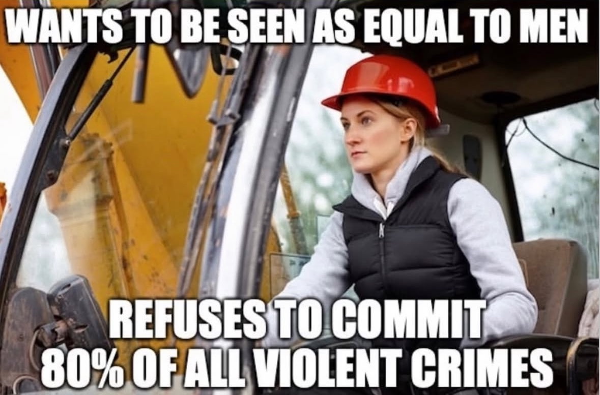 If it helps at all, it’s not entirely true, statistically, just very slightly funny when not explained. Men are like 75% of the victims in homicides and lead in other violent crimes, if my Googling is correct. Women do lead in other categories, though, so it’s still competitive. I’m not trying to take anything away from anybody. But I also admit “borders on bad taste” is pretty much the line I walk.