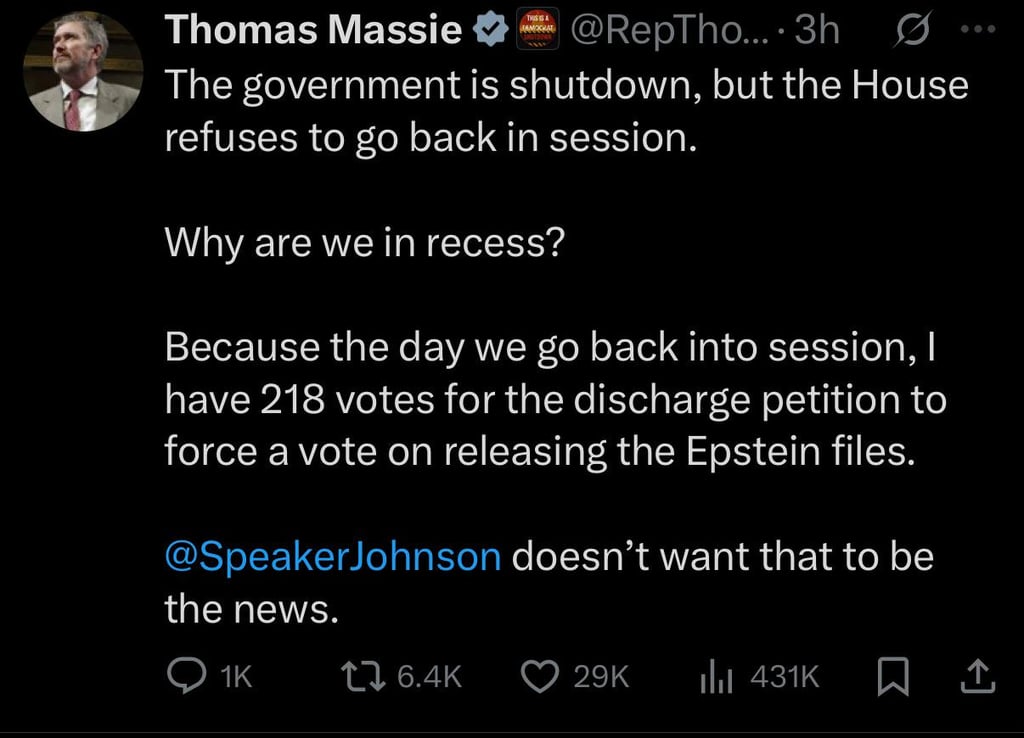 arrow-up1378arrow-down1imageMassie says the government shutdown is really about Epsteinimg.gvid.tvx0x7@lemmy.world to Microblog Memes@lemmy.worldEnglish · 14 days agomessage-square22fedilink