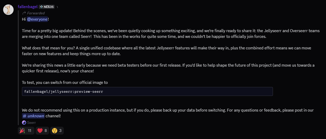 arrow-up1356arrow-down1imageJellyseerr and Overseerr merging into one, gonna be called Seerrlocklemmy.worldDagnet@lemmy.world to Selfhosted@lemmy.worldEnglish · 19 hours agomessage-square68fedilink