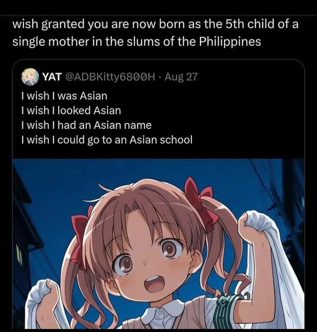 And then there were all the kids wishing they were in America rather than their boring first-world suburb/provincial town. They didn’t get any more specific, and I imagine they were probably thinking of New York/LA/somewhere glamorous, and would have been bitterly disappointed if the maliciously-helpful wishing genie had whisked them away to a rustbelt town in Ohio or some unincorporated community in Alabama or wherever.