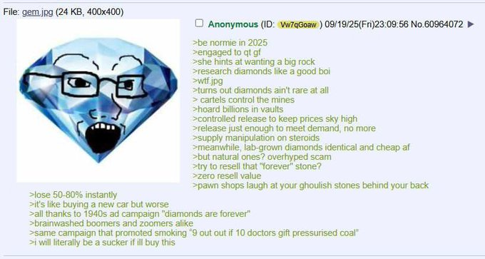 arrow-up1561arrow-down1imageAnon shops for diamondssh.itjust.works🍹Early to RISA 🧉@sh.itjust.worksM to Greentext@sh.itjust.works · 9 days agomessage-square136fedilink